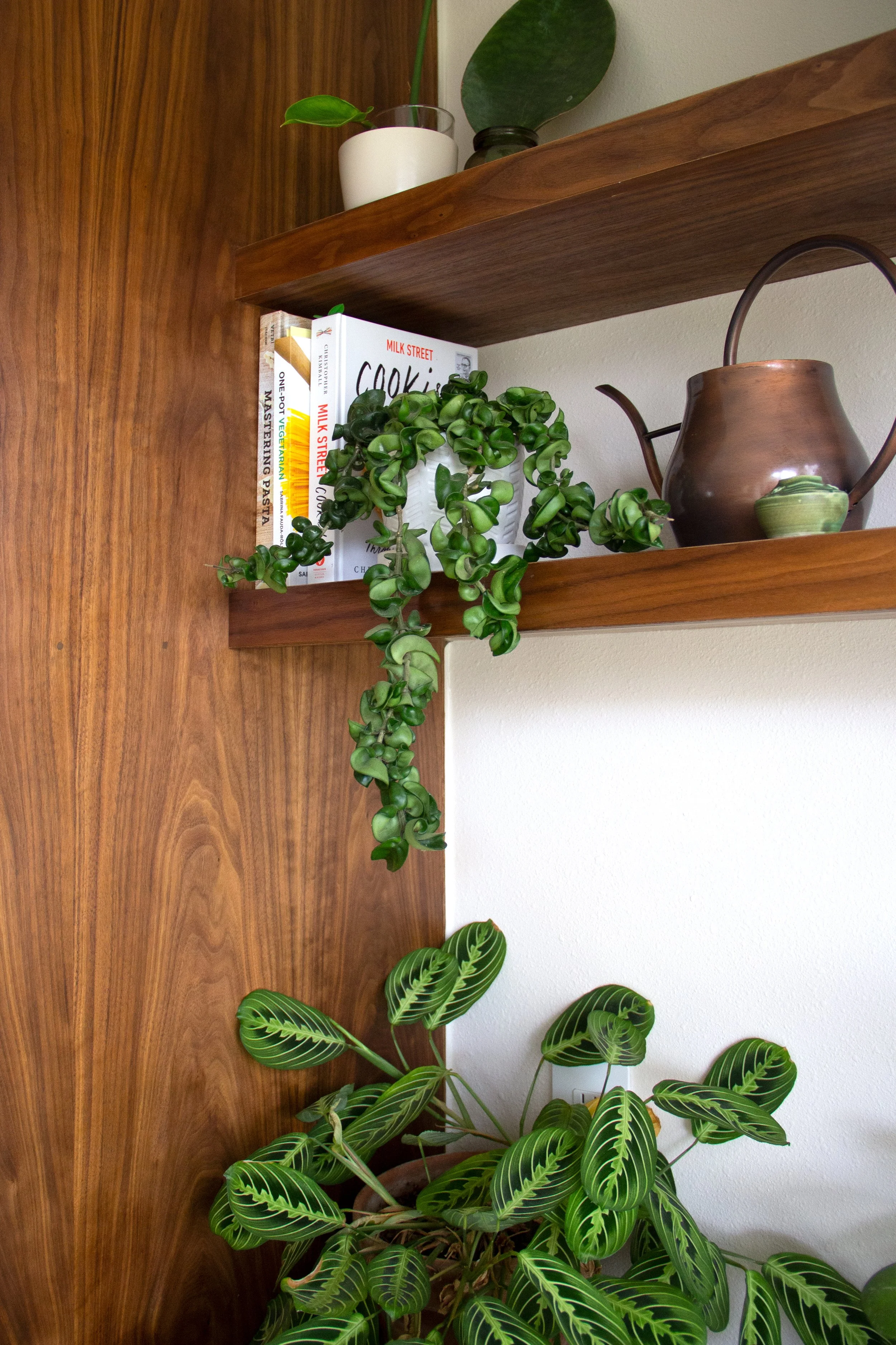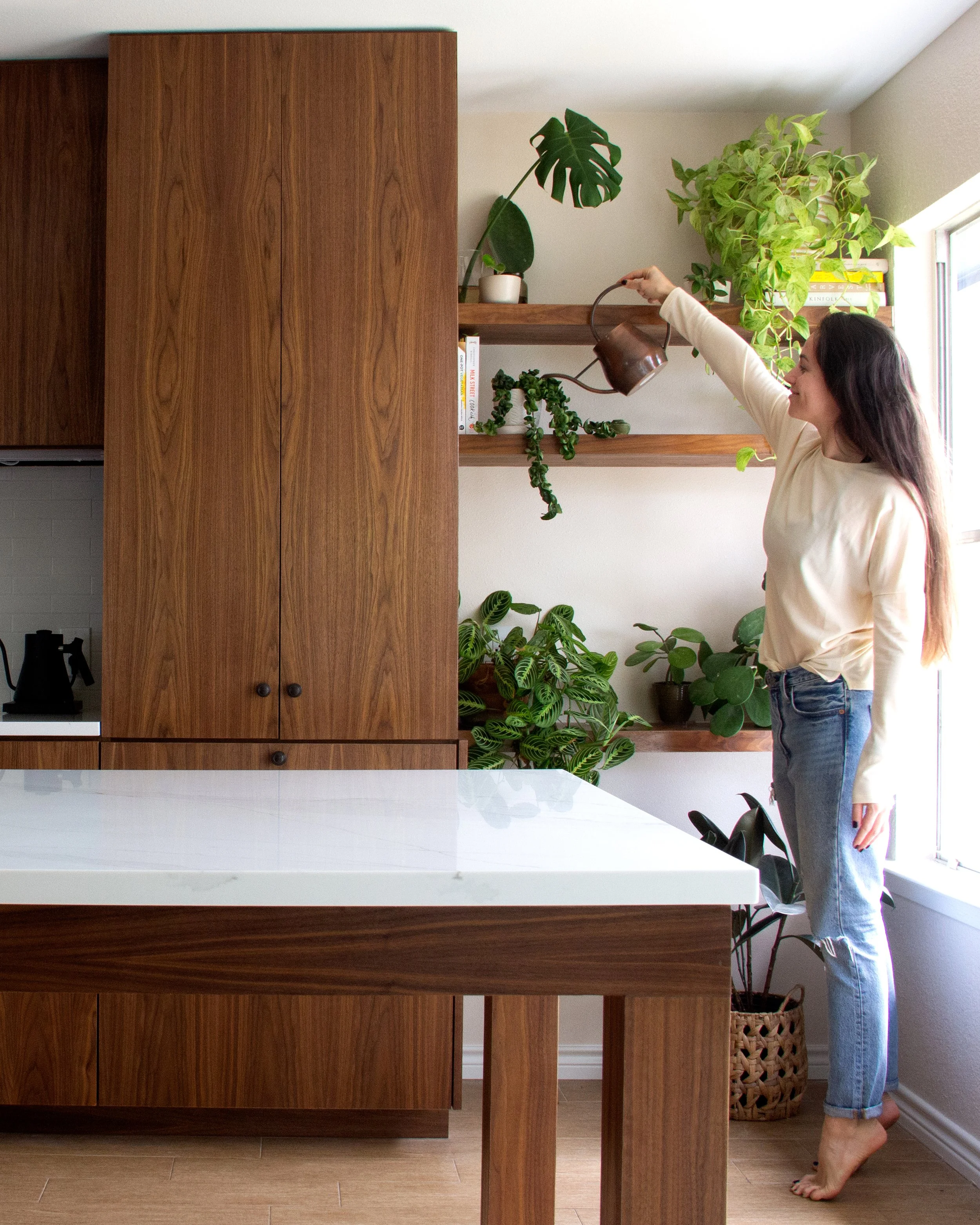 A large kitchen island doubles as a worktop and a dining space in place of an old galley kitchen. Walnut cabinetry along the back kitchen wall matches the length of the island. Open shelving spans from an end pantry cabinet to the exterior wall, providing a well lit home to the client’s ever-growing plant collection.